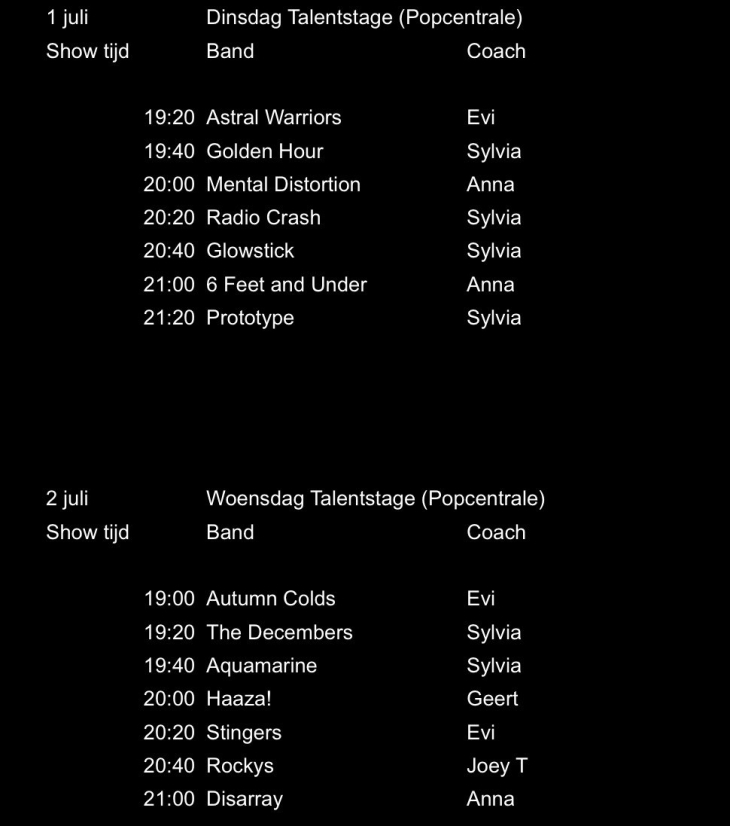Check goed het speelschema, zodat je weet op welke dag jouw band speelt. En heel belangrijk: blijf de hele show!